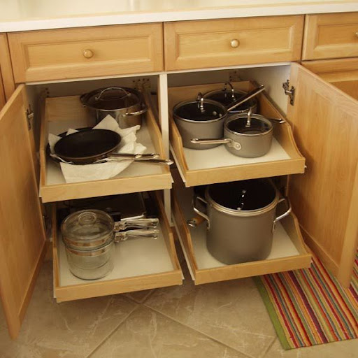 Slide-out racks are perrfect to store your frying pans. We offer an expansive selection of cabinet pull out shelves to simplify your cabinets reduce clutter and organize your storage. Our pull out sliding shelving and kitchen cabinet accessory store offers top quality pull out shelves are custom made to fit your kitchen bath room and pantry cabinets rolling slide out shelves that rollout to make your life easier.